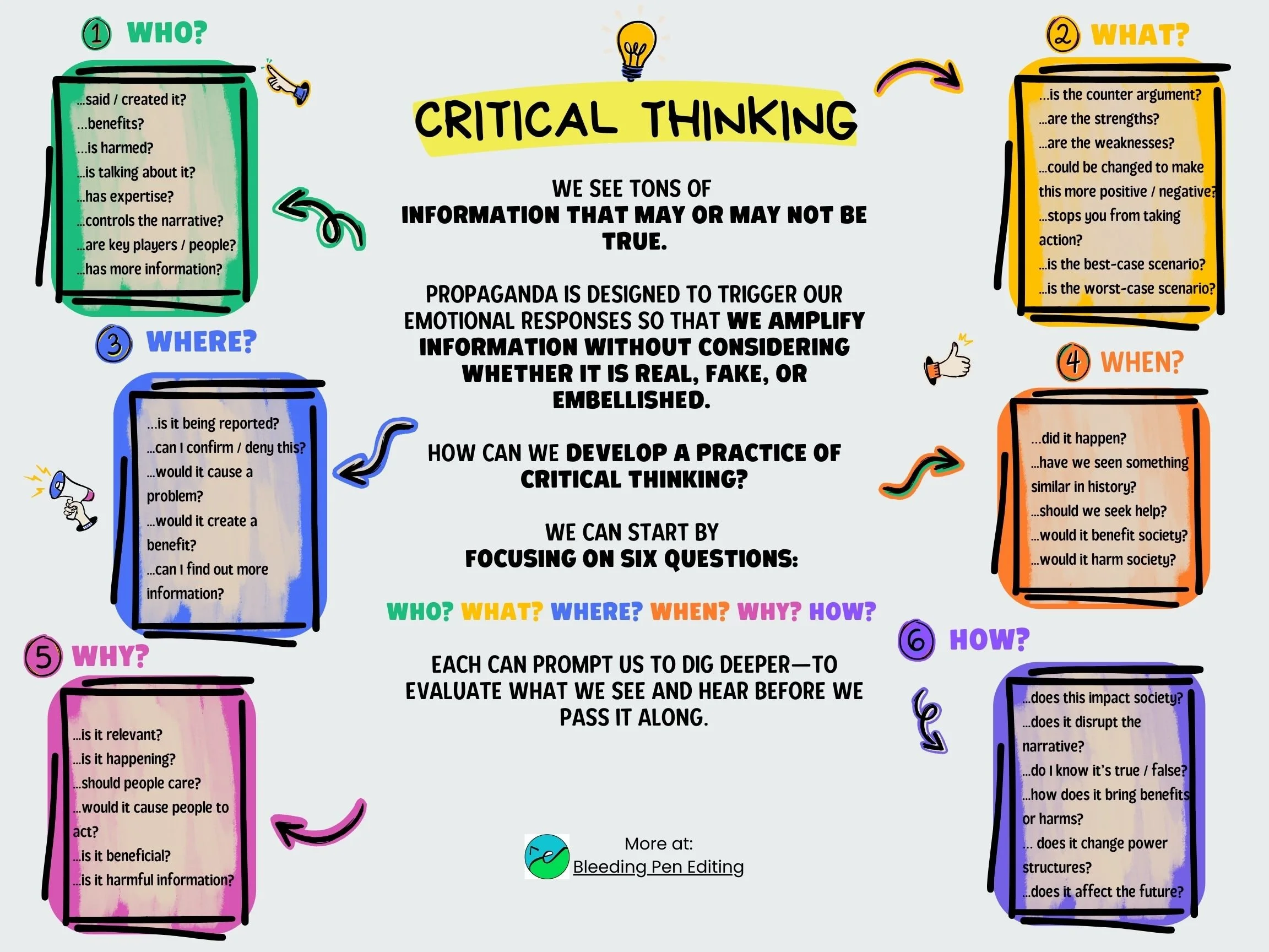 To develop critical thinking skills and push back against rampant propaganda, ask yourself these 6 extended questions: